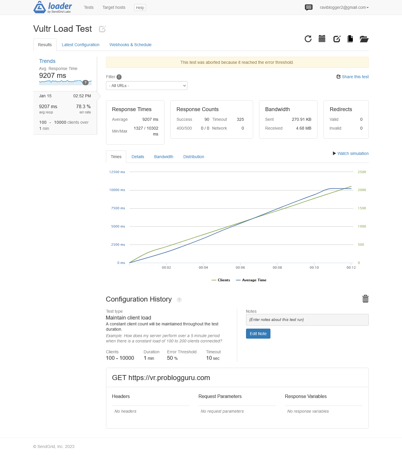 Kamatera passed the test, but the Vultr server crashed after only 2103 clients per second. The test failed in 00:12 seconds, and the server was unavailable for 10 minutes.