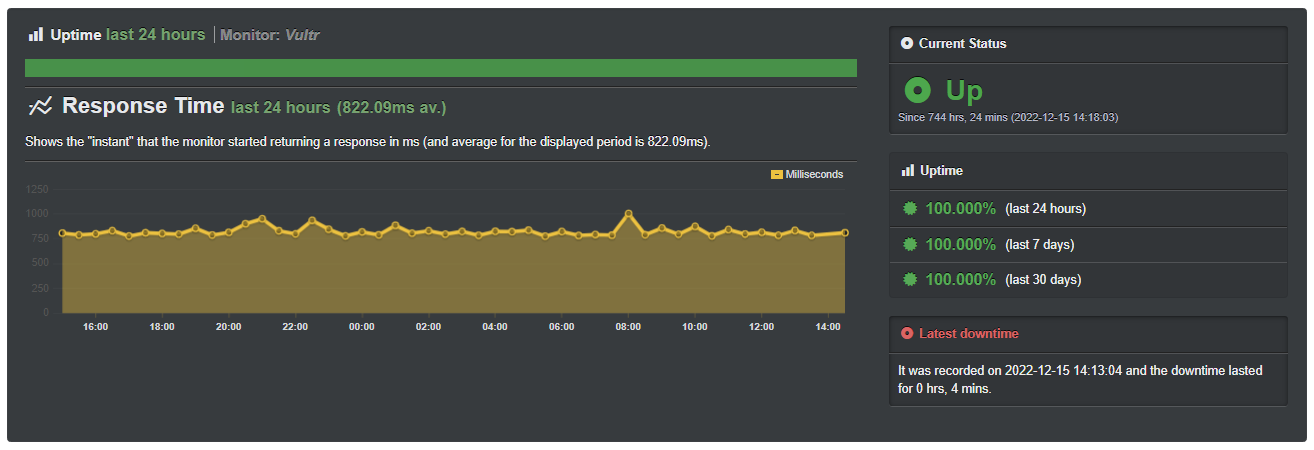 During the 30-day uptime test, Kamatera and Vultr remained stable. However, Vultr went down for about 4 minutes before 30 days, denting a small doubt on Vultr’s stability.